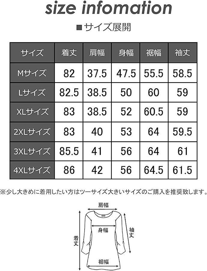 ・「サイズ」「M」着丈82 / 肩幅37.5 / 身幅47.5 / 裾幅55.5 / 袖丈58.5・「L」着丈82.5 / 肩幅38.5 / 身幅50 / 裾幅60 / 袖丈59 ・「XL」着丈83 / 肩幅38.5 / 身幅52 / 裾幅60.5 / 袖丈59 ・「2XL」着丈83 / 肩幅40 / 身幅53 / 裾幅64 / 袖丈59.5 ・「3XL」着丈85.5 / 肩幅41 / 身幅56 / 裾幅64 / 袖丈61・「4XL」着丈86 / 肩幅42 / 身幅56 / 裾幅64.5 / 袖丈61.5