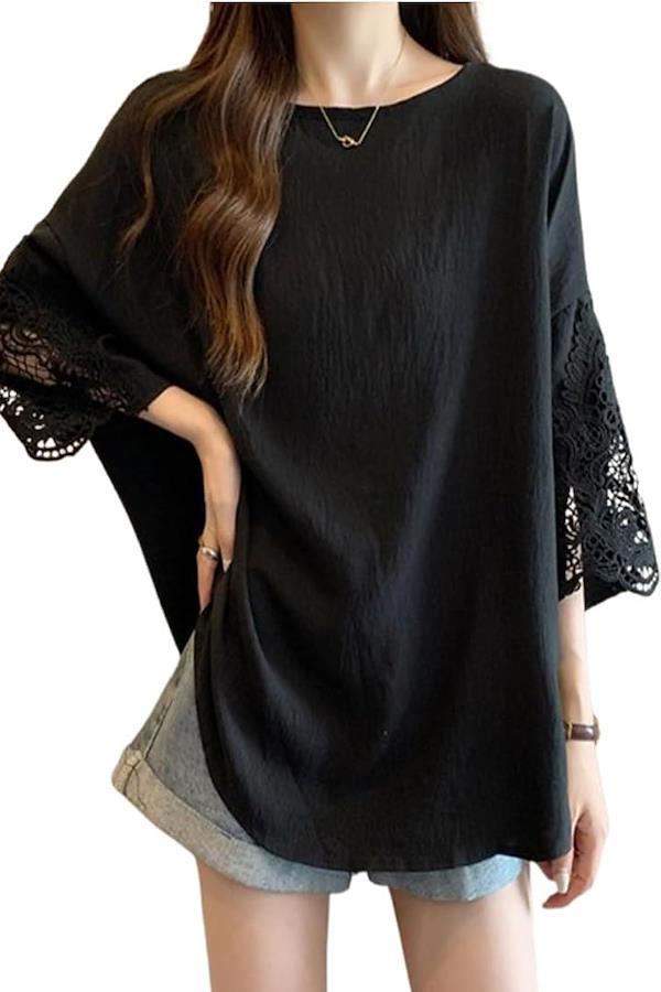 Women's tops, 5/8 sleeves, lace trim, sheer, elegant, work wear, office, casual, cool, figure-covering, simple, plain