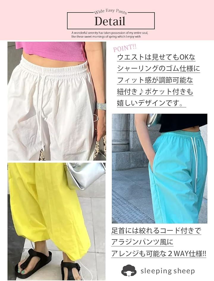 足首には絞れるコード付きで、キュッと絞ればアラジンパンツ風にアレンジも可能な2WAY仕様..アレンジも楽しめるから、スニーカーに合わせてもヒールに合わせても..シンプルでも目を引く、こなれ感とイマドキ感が手に入るワイドパンツです。