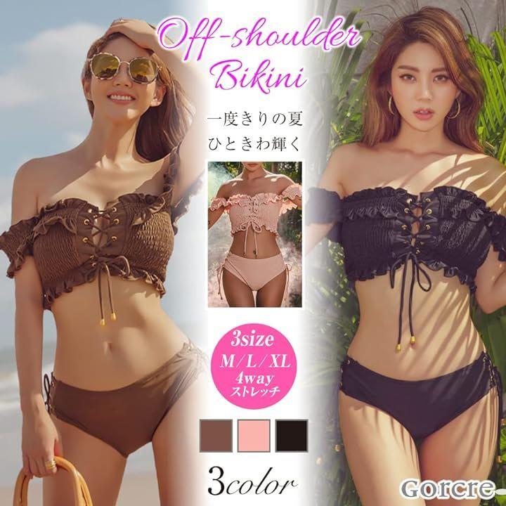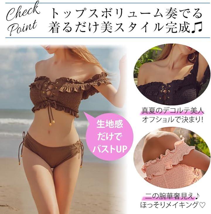 オフショルダーで、肩幅の華奢見え、デコルテをセクシー美人に。今なら、脱着可能で長さ調節もできる細めの肩がけストラップもセットで、お好みのスタイリングを。ふんわりフリルで、気になる二の腕まわりとウエスト付近を華やかで、ほっそりメイキング。細い部分をあえて露出で、華奢見え効果。ショーツはミドル丈で脚長印象、360°フェミニsンで女性らしいライン。