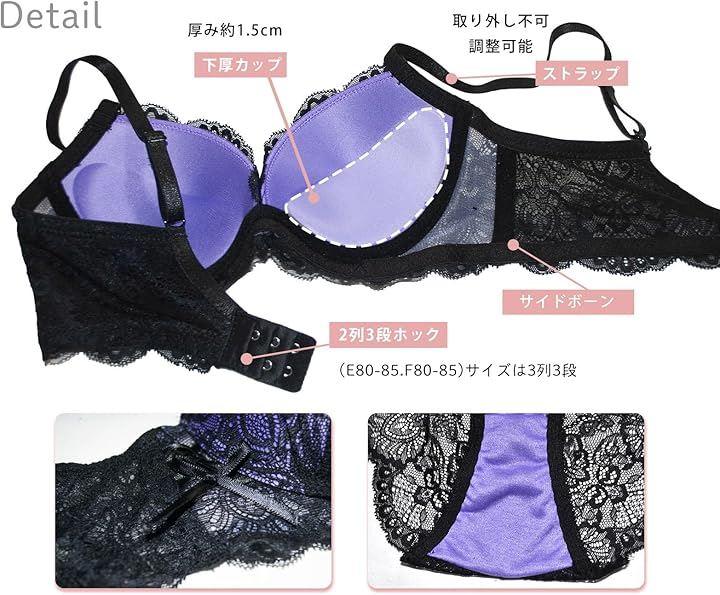 「 特徴 」総レース / Uバック / 花柄 / 脇高 / 刺繍 / ストラップ調整可 ・ 取り外し不可 / パッドポケットなし / 取り外しパッドなし / 下厚カップ約 1.5cm / ワイヤーあり / サイドボーンあり / 透け感 ・ 伸縮性あり / 2列x3段ホック / E80,85 F80,85 3列3段ホック