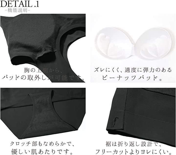 「特徴」シームレス/ノンワイヤー/パッドポケットあり/取り外しパッド付き/ホック無し/伸縮性あり