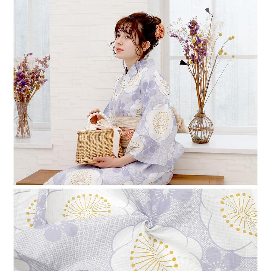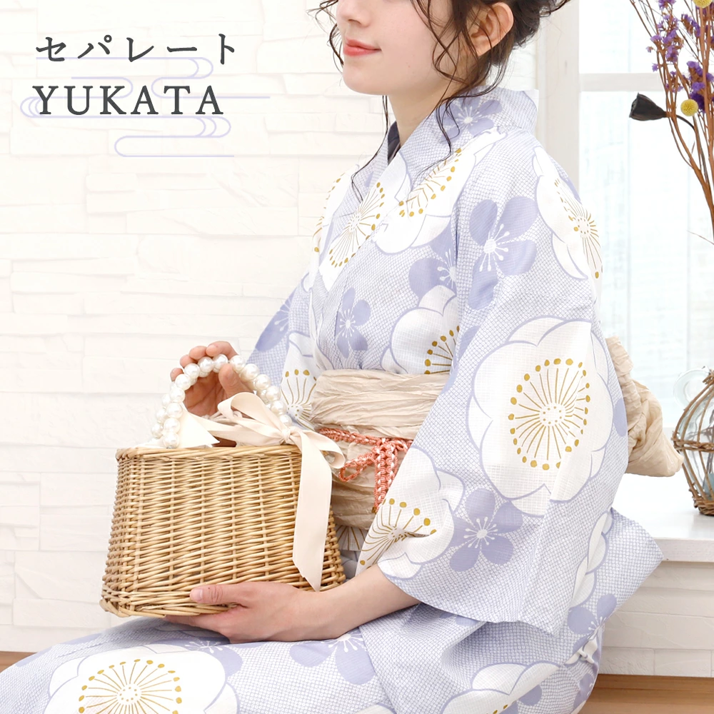 まるで夏の夕空に咲いた梅のように、可憐でやさしい雰囲気をまとうセパレート浴衣「紫の空に咲く梅」。藤色の地に白と黄の梅模様が広がり、涼しげで爽やかな印象を与えてくれます。