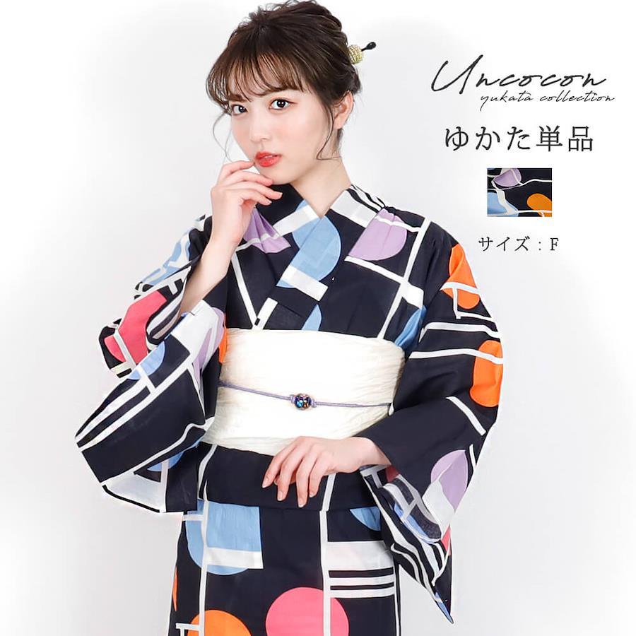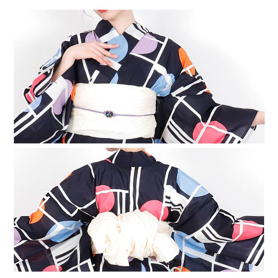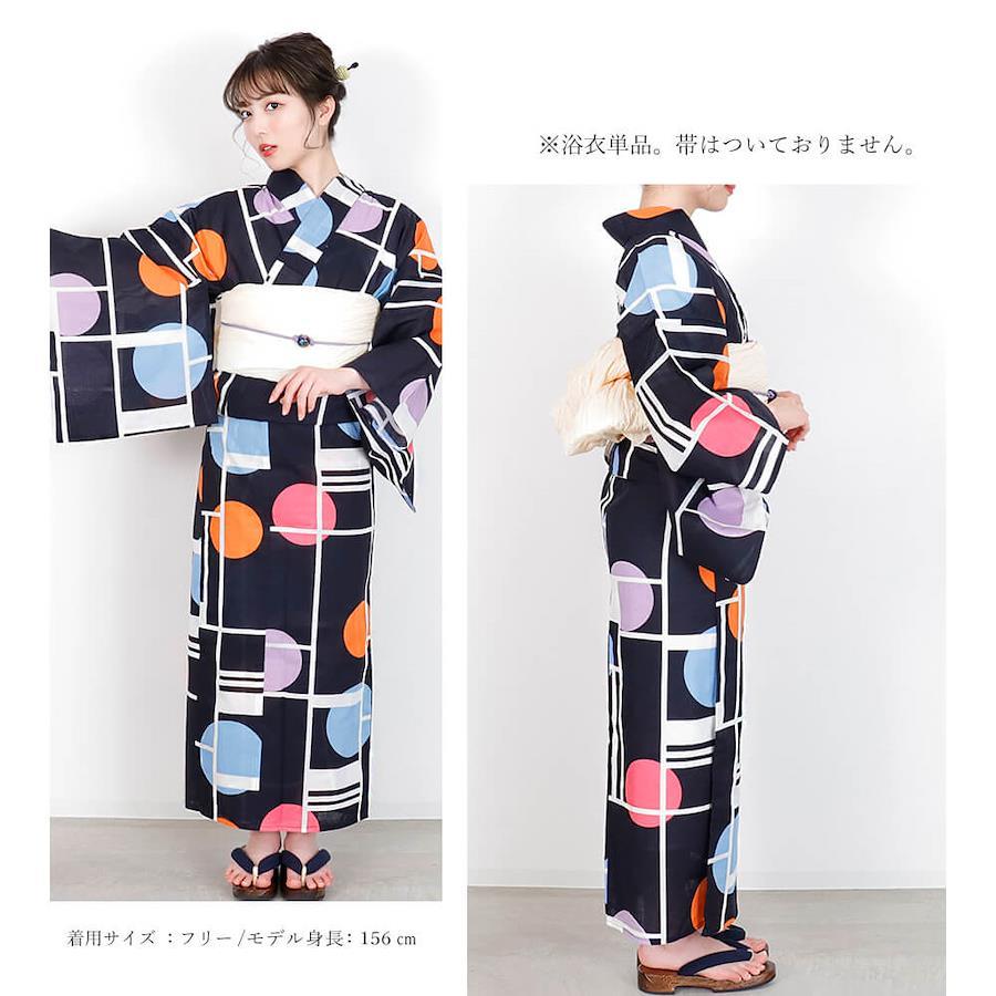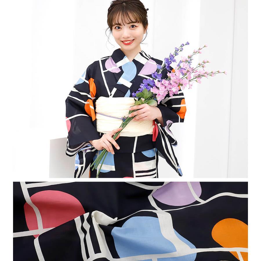 シンプルなのに目を引く、モダンアート風の幾何学模様が魅力のレディース浴衣です。濃紺の地にカラフルな円とラインが規則的に並び、洗練された雰囲気に。和と洋が融合したようなデザインで、周囲と差がつくおしゃれな着こなしが叶います。