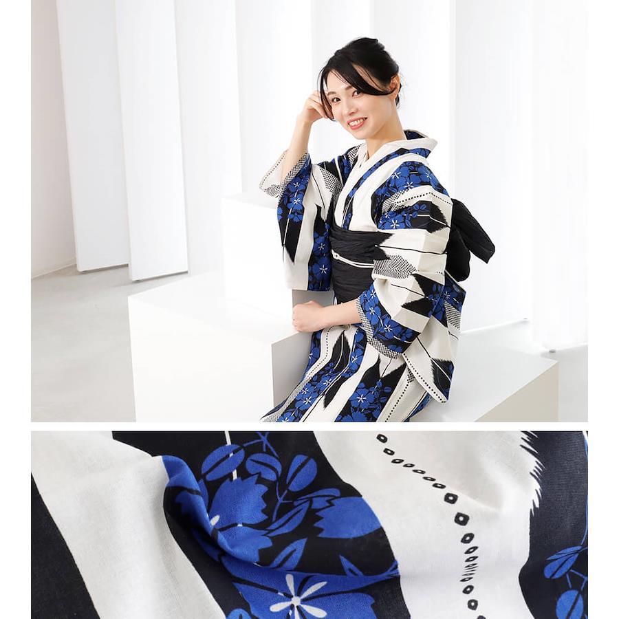 上品なブルーの花柄と洗練されたストライプ模様が魅力の綿100%浴衣。お仕立て上がりで届いたその日にすぐ着用OK!涼しさと肌ざわりにこだわった快適設計で、花火大会や夏祭りなどのイベントはもちろん、おしゃれな普段着にもおすすめです。