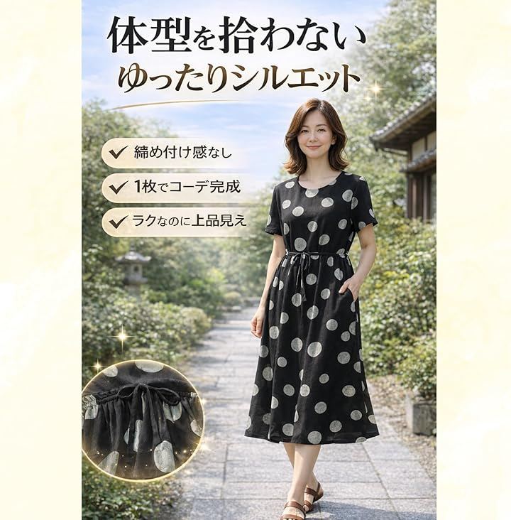 軽やかで動きやすい着心地が魅力の、水玉デザインワンピ。