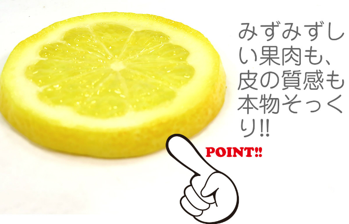 みずみずしいスライスレモンの食品サンプルアクセサリーです。表も裏もどちらもちゃんと作ってます。皮の質感も薄くたって手を抜いていません。