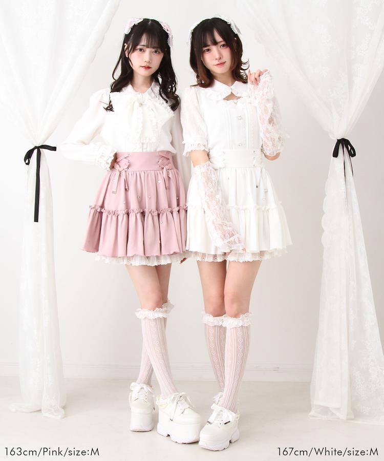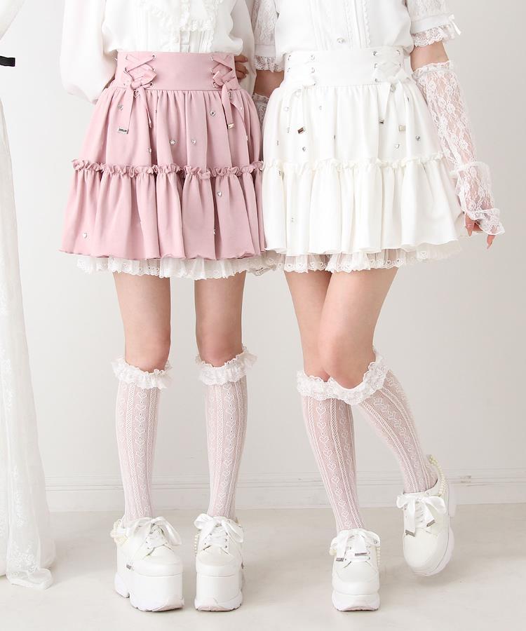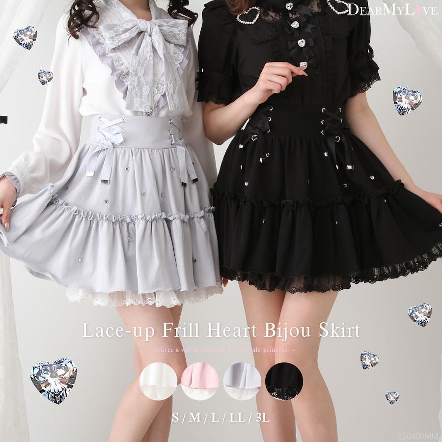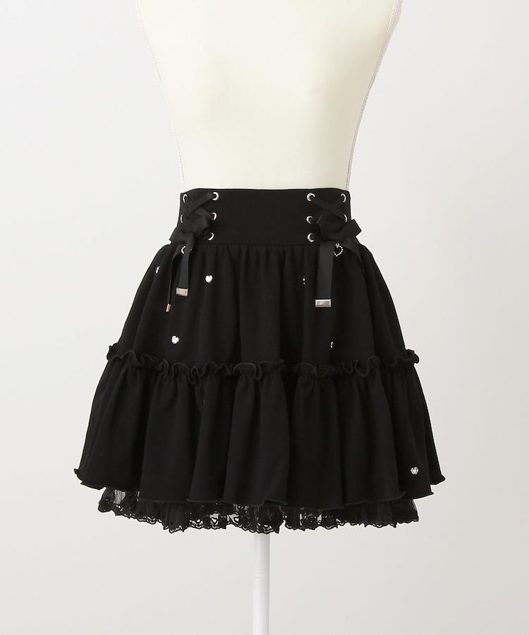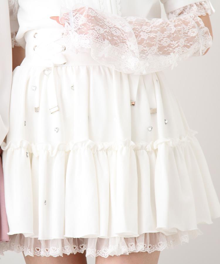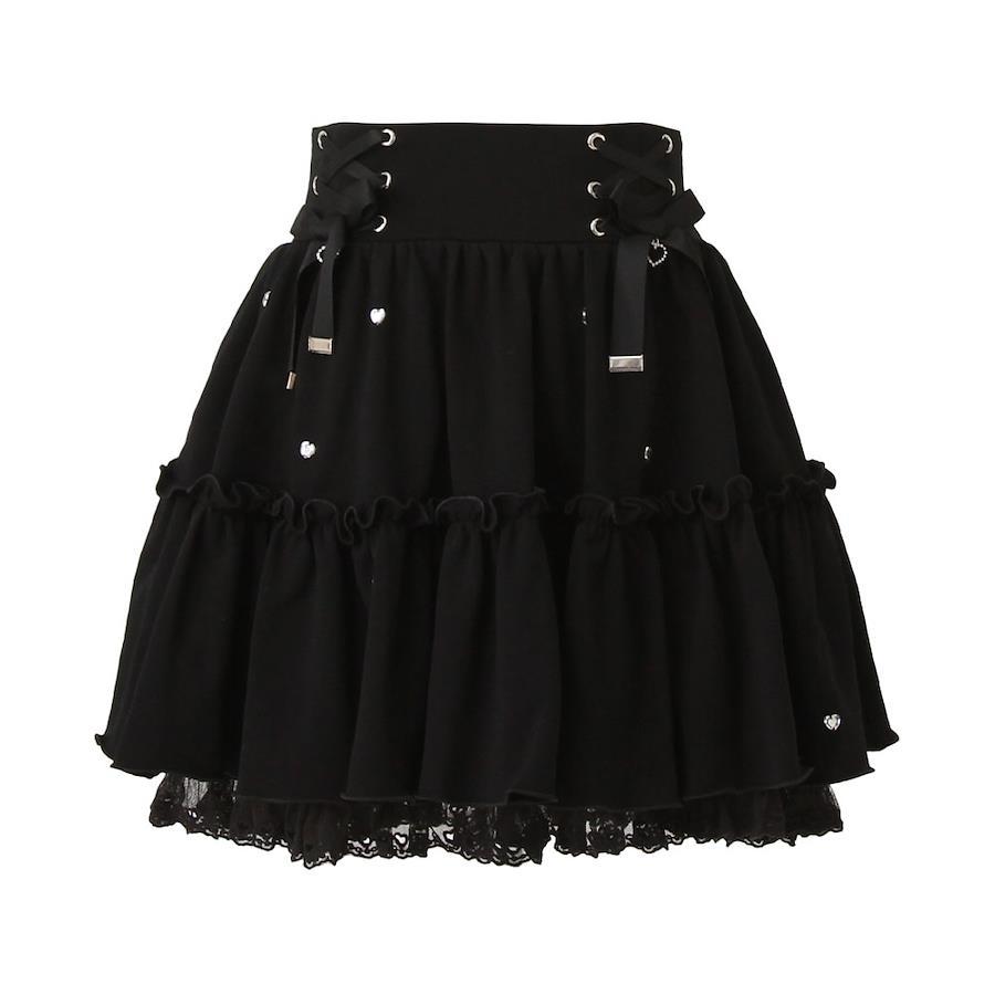 キラキラハートストーンが散りばめられたかわいい裏毛スカートが登場♪【デザイン】ハートストーンが散りばめられたかわいい裏毛スカートです♪ウエストデザインにはレースアップがポイントになっています。フリルたっぷりのふわっとしたシルエット感がかわいいく裾にはハートレースがついています。かわいくて万能な裏毛スカート、是非ともオススメです。【素材】厚すぎず薄すぎない裏毛生地です。【コーディネート】ハートストーンの裏毛ショートパーカーと合わせるとトレンド感あるスポーティーでかわいいコーデが完成します♪これからの季節、Tシャツやカットトップスにも合わせるとかわいいです!《透け感》なし 《生地の厚さ》普通 《裏地》あり 《伸縮性》なし《生産国》中国