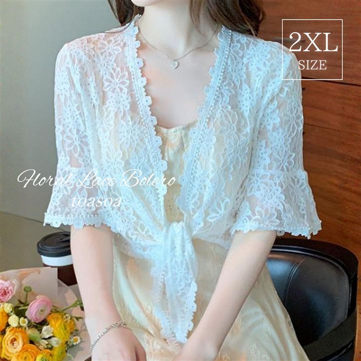 さっと羽織れる軽さが魅力の総レース リボン ボレロ。