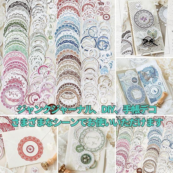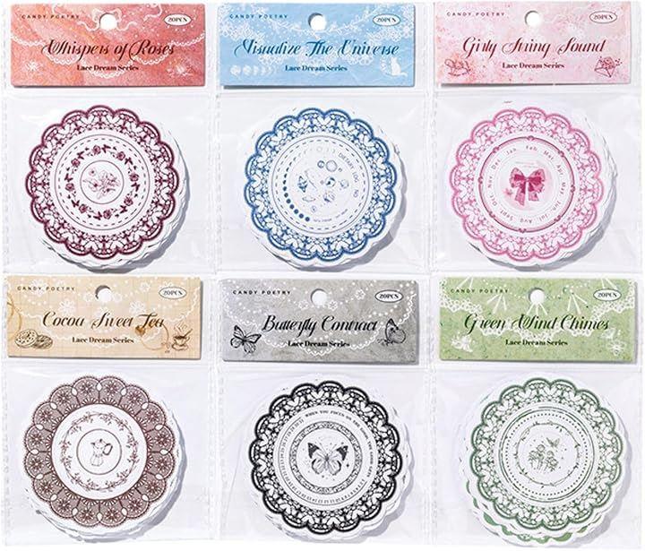 様々な色とデザインのレースモチーフの丸形ステッカーです。