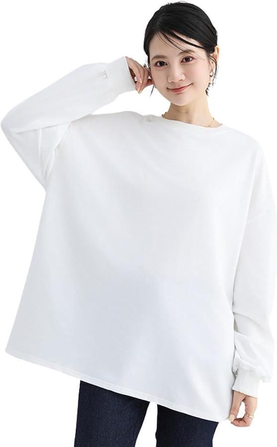 「商品の特徴(1)」ロンtとして使えるこちらのレディース長袖オーバーtシャツは、もちっとした質感で、生地の厚みはTシャツとスウェットの間。