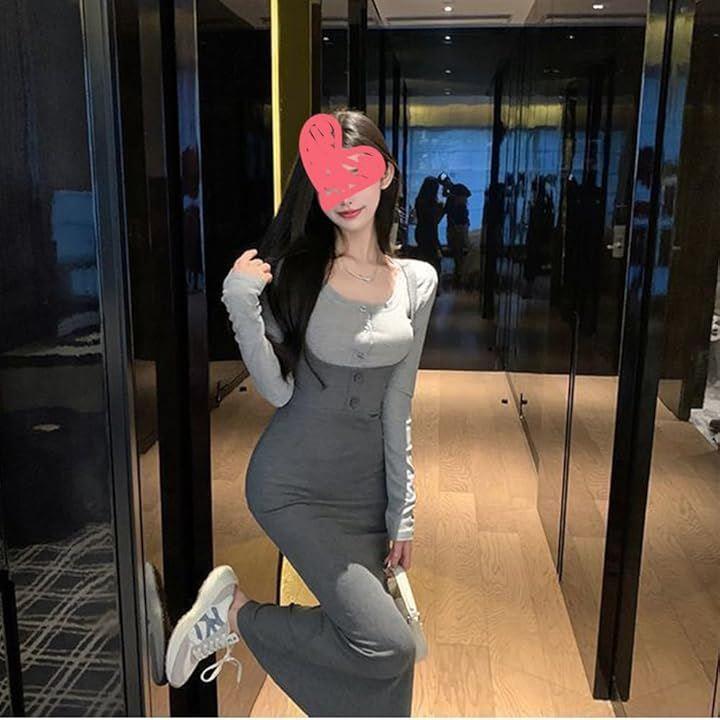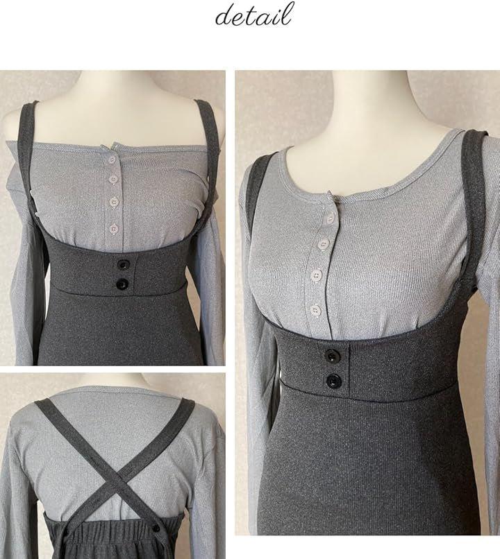 サスペンダーワンピースは胸を強調し、カジュアルで可愛らしい印象に。