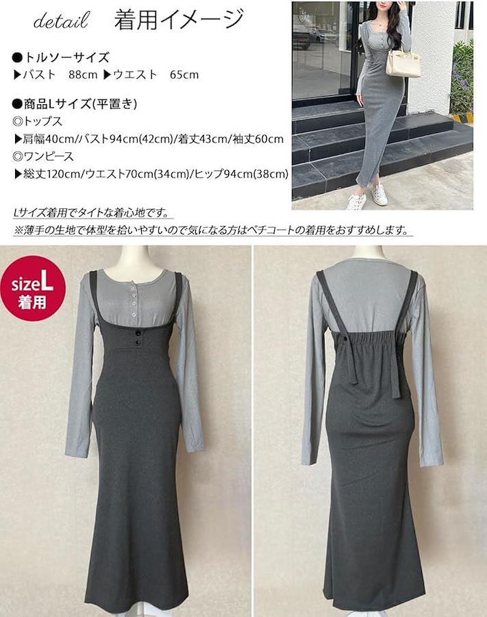 「L」トップス▶ 肩幅40cm / バスト94cm(42cm) / 着丈43cm / 袖丈60cm ワンピース▶総丈120cm ウエスト70cm(34cm) ヒップ94cm(38cm)