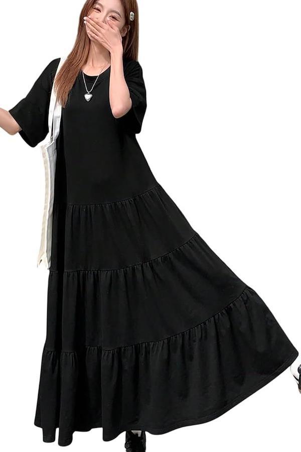 シンプルでありながら存在感を放つブラックのティアードロングワンピースは、一枚で完成された着こなしを叶えてくれるアイテムです。
