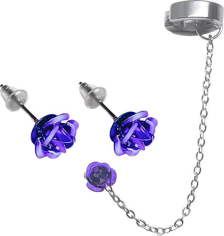 Rose Chain Earrings, Set of 3, for Both Ears, Rose Stud Ear Cuff, Stainless Steel, for Men and Women