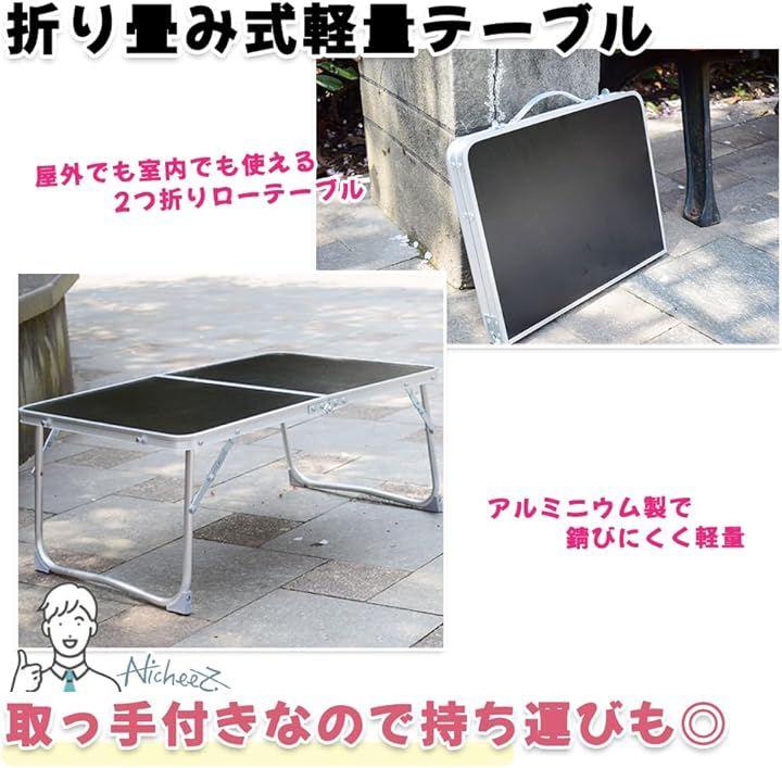 「商品内容」 折り畳み軽量ローテーブル 材質:アルミニウム/高圧縮パネル カラー:ブラック サイズ:縦/約42cm 横/約62cm 高さ/約27.5cm 重量:約1.4kg