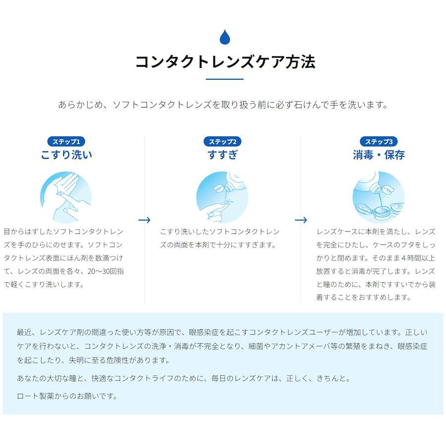 健やかな瞳のための、ソフトコンタクトレンズ用消毒液です。こすり洗い・すすぎ・消毒・保存がこれ1本でOK。しっかりとこすり洗いをすることで、レンズの汚れや雑菌を除去します。うるおいのベールを形成する「ポロクサマー」を配合。うるおいのベールがレンズをしっとり包み込んで、気持ちの良いつけ心地が続きます。(レンズケース付き) 商品サイズ (幅×奥行×高さ) :395mm*277mm*219mm ブラント名:ロートコンタクトケア 内容量:500ml×3個 メーカー名: ロート製薬 原産国:日本 涙に近いpHで、優しいつけ心地です。