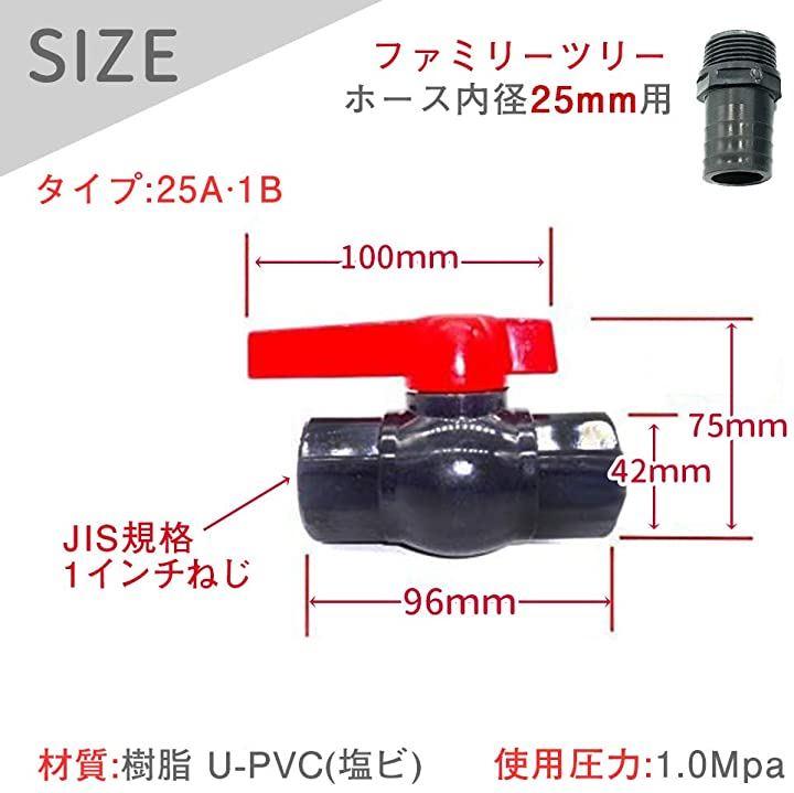 ボールバルブ仕様タイプ:25A・1B接続:JIS規格1インチねじ材質:樹脂 U-PVC(塩ビ)使用圧力:1.0Mpaファミリーツリー:ホース内径25mm用/30mm用