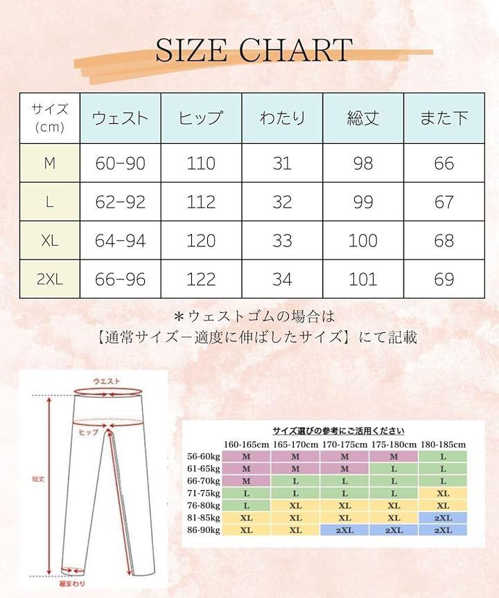 「カラー」ブラック オフホワイト ブラウン ネイビー ベージュ 「サイズ」M~2XL M ウエスト60cm-90cm/ヒップ110cm/丈98cm/また下66cm/わたり31cm、L ウエスト62cm-92cm/ヒップ112cm/丈99cm/また下67cm/わたり32cm、XL ウエスト64cm-94cm/ヒップ120cm/丈100cm/また下68cm/わたり33cm、2XL ウエスト66cm-96cm/ヒップ122cm/丈101cm/また下69cm/わたり34cm