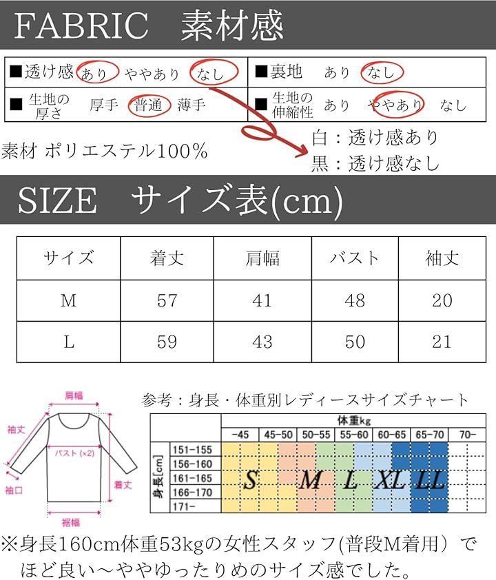 「素材」ポリエステル100%「カラー」ブラック(黒) ホワイト(白)「サイズ(cm)」M 着丈57/バスト48/肩幅41/袖丈20 L 着丈59/バスト50/肩幅43/袖丈21