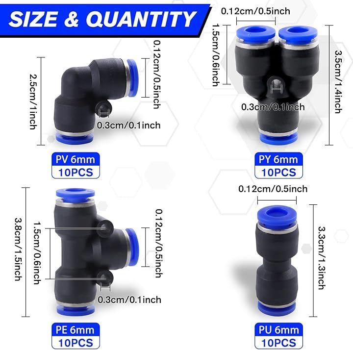 パッケージ内容:6mm分岐継手10個、6mmエルボ継手10個、6mmT字継手10個、6mmストレート継手10個、それぞれ外径6mmパイプに対応します。