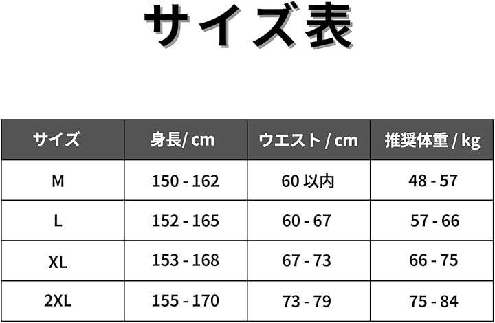 2XL:推奨身長155cm-170cm、推奨ウエスト約73~79cm、推奨体重75kg-84kg