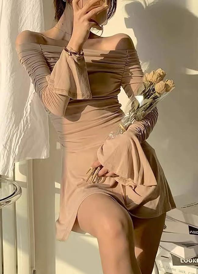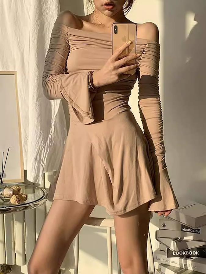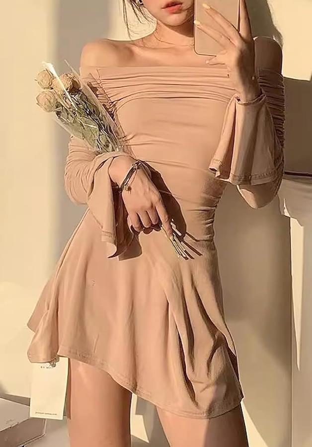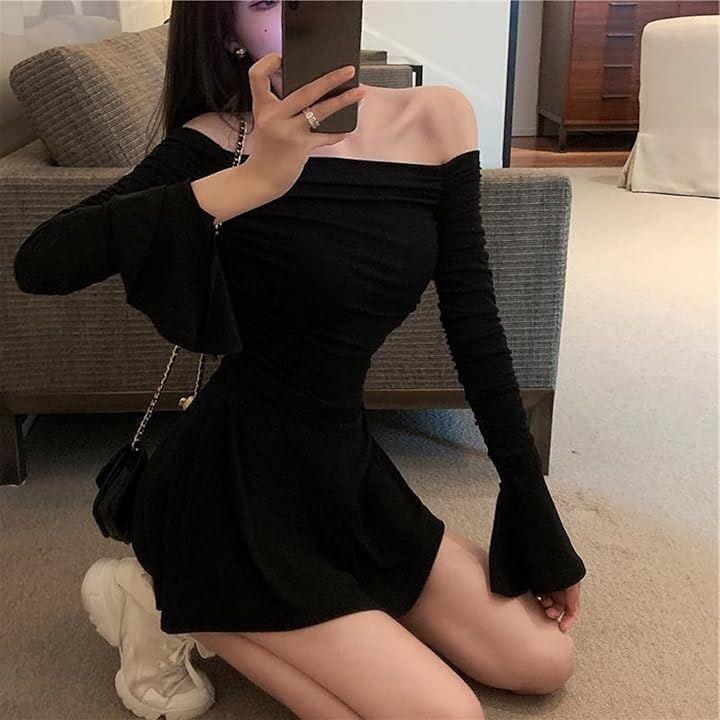 「魅せる肩ラインとフィット&フレアで視線を独り占め セクシーさと可愛さの絶妙バランスのフレアワンピ」 フィット感のあるトップ部分とふわっと広がるフレアスカートが、可愛らしさと女性らしさを引き立てます。