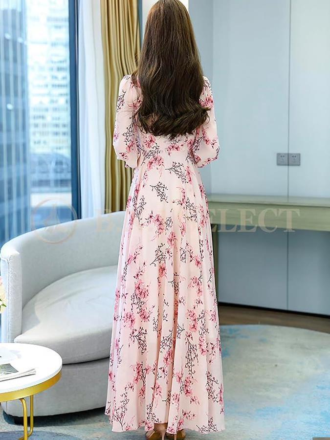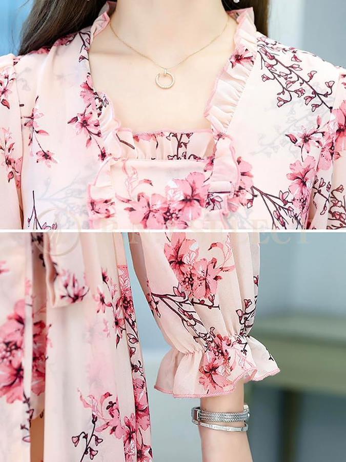 繊細に描かれた花柄はあなたの魅力を引き立て、ゆったりとした袖と裾が動き優雅な印象に。
