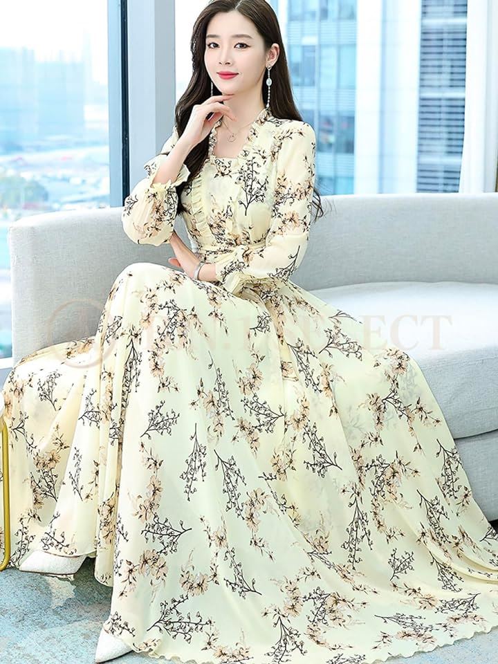 軽やかなシフォン素材で作られ、優しく体を包み込むデザインが、上品で女性らしいシルエットを作り出します。