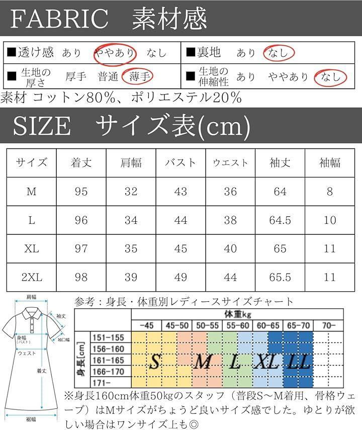 「素材」80%コットン、20%ポリエステル「カラー」黒、褐色「サイズ(cm)」M 着丈95/肩幅32/バスト43/ウエスト36/袖丈64/袖幅8 L 着丈96/肩幅34/バスト44/ウエスト38/袖丈64.5/袖幅10 XL 着丈97/肩幅35/バスト45/ウエスト40/袖丈65/袖幅11 2XL 着丈98/肩幅39/バスト49/ウエスト44/袖丈65.5/袖幅11