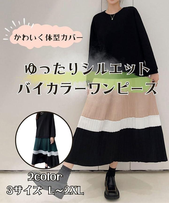 「大人可愛い。春秋冬のお出かけスタイルにぴったりな「ゆったり ドッキング ワンピース」歩く度にふわっと広がるスカートが映えるゆったりシルエットのバイカラーワンピース シンプルなトップスにふわっと揺れるバイカラープリーツスカートが可愛いワンピースです。