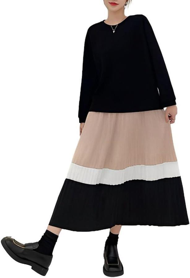このプリーツスカートと異素材のドッキングワンピースは、おしゃれなバイカラーデザインが目を引く一着です。