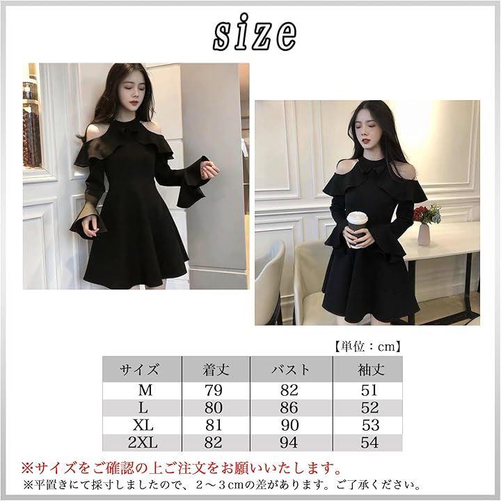 セクシーなオープンショルダーとたっぷりのラッフルフリルがやわらかさと華やかさを添えたシックなブラックのミニ丈フレアワンピースです。