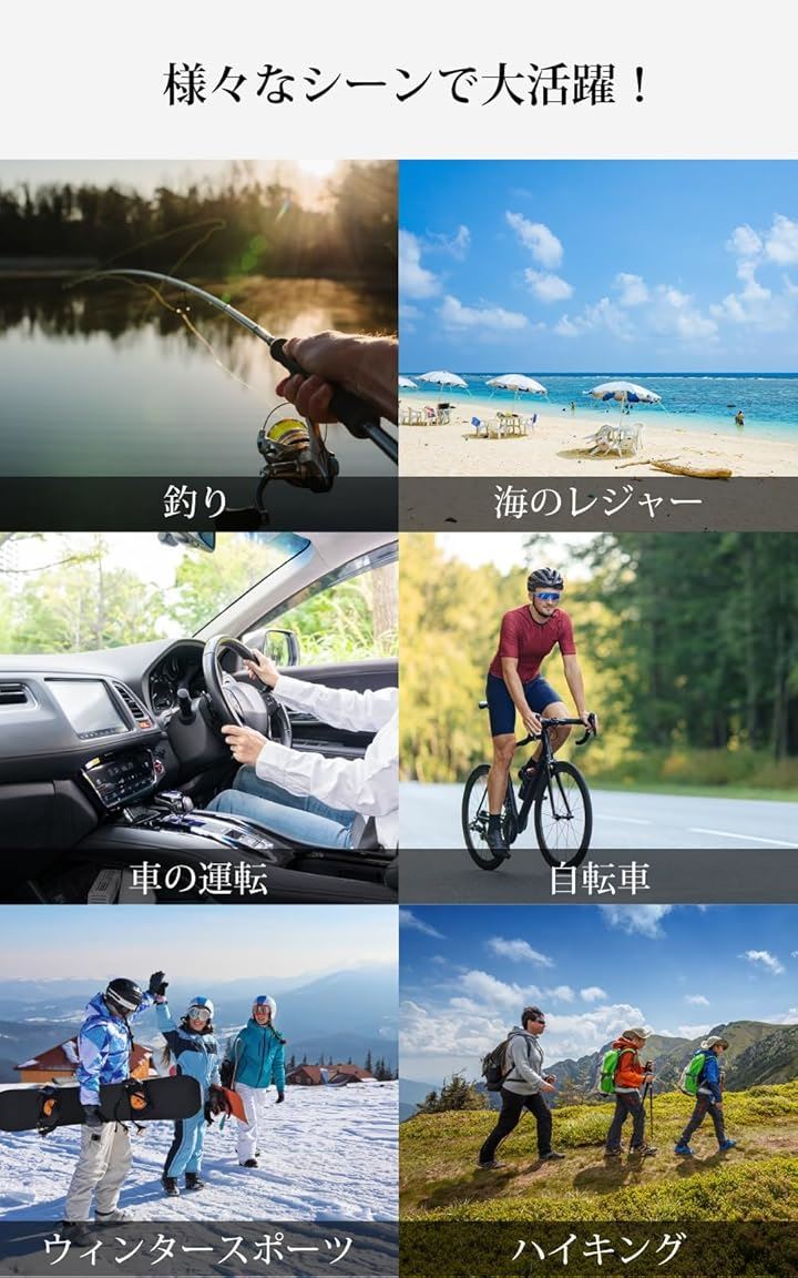 目の疲れの程度もは通常のサングラスより良く、これらの性能から「運転、海、釣り、スポーツ、アウトドア、サイクリング、登山」など様々な活動に適しています。