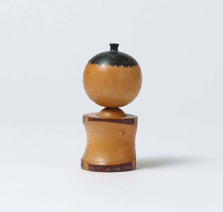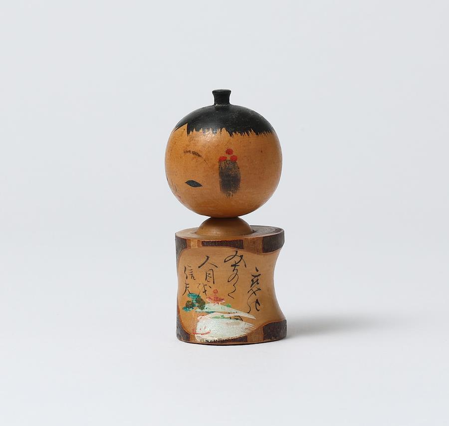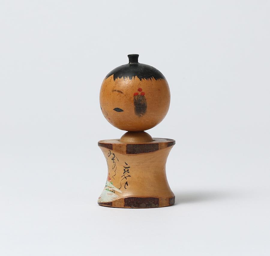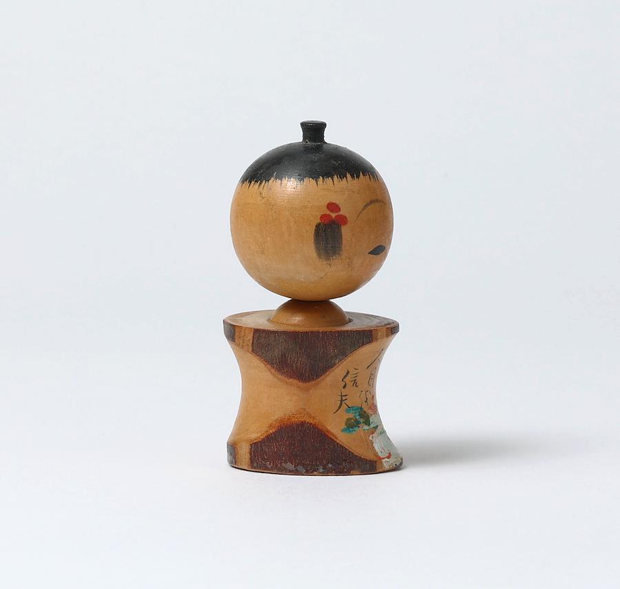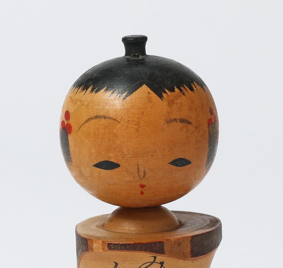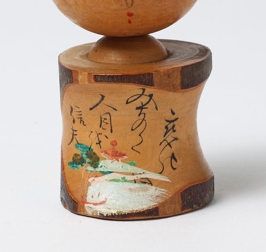 ★こけしカテゴリー:新型(しんがた)こけし(Shingata kokeshi doll)★作者:作者不明★デザイン:丸い顔がゆらゆらと動くスタイルのヴィンテージ新型こけしです。胴には「飯坂小唄」という詩の一部「恋のみちのく人目を信夫」と書かれています。意味は「みちのくでの秘密の恋」です。「みちのく」は東北、日本本州の北部でこけしを製作している地方を言います。「飯坂」は福島県の温泉地域で、「小唄」は「歌」の意味です。「信夫」は人目を忍ぶと音をかけています。