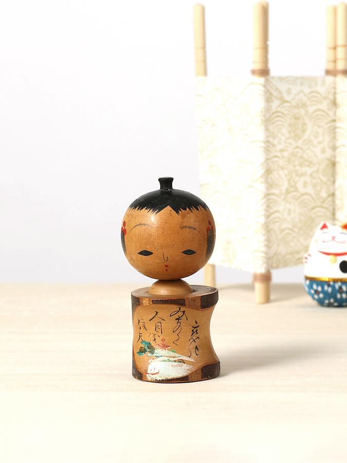 ★素材:木★コンディション:経年によりくすみがあります。(写真をご覧ください)★サイズ(約):・高さ 8cm / 3.14inch・直径 頭 3.5 cm / 1.37inch、底 3.8cm / 1.49inch・重さ 31.5g※パソコンやスマートフォンなど、ご覧になられる環境により商品写真の色と実際の色が異なる場合があります。どうぞご了承ください。★お取り扱いについて★※こけしの顔や模様は水性染料で描かれているため、たいへん水に弱いです。色落ちを避けるためにも、お掃除の際は乾いた布で拭いてあげてください。※こけし本体は木でできています。急な乾燥や直射日光、エアコンなどの暖房器具の近くを避けてお楽しみください。また、あまり湿気の多い場所ですとカビが生えることがありますのでご注意ください。