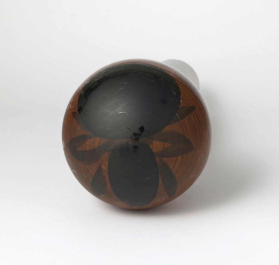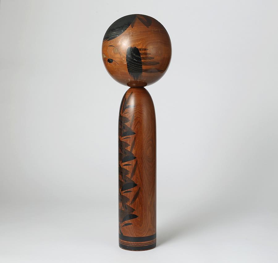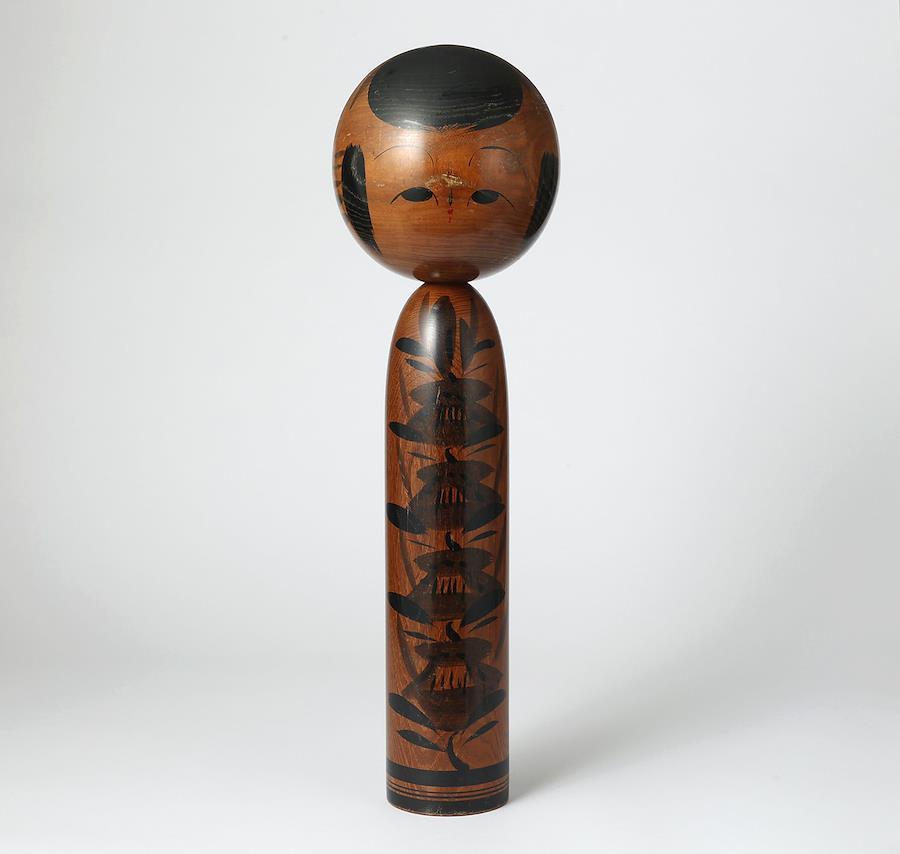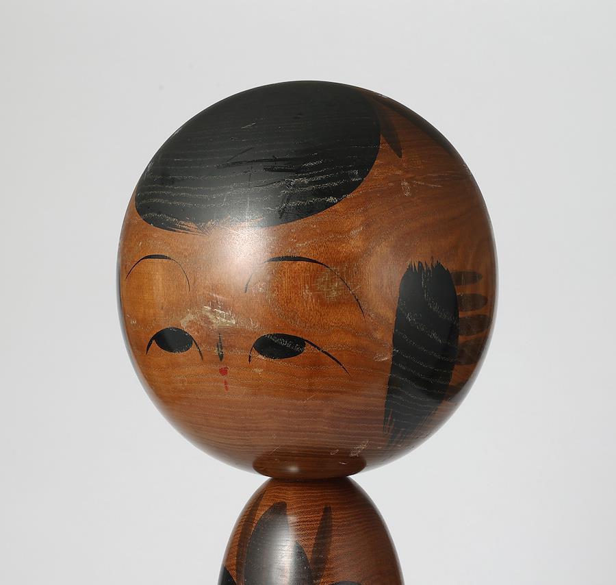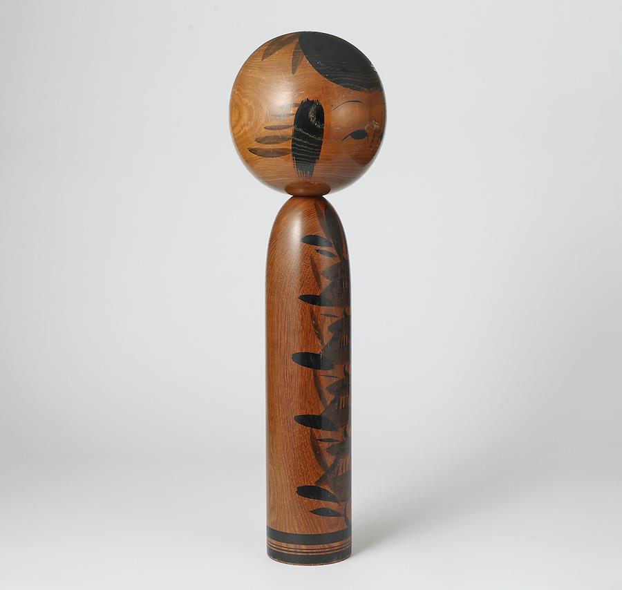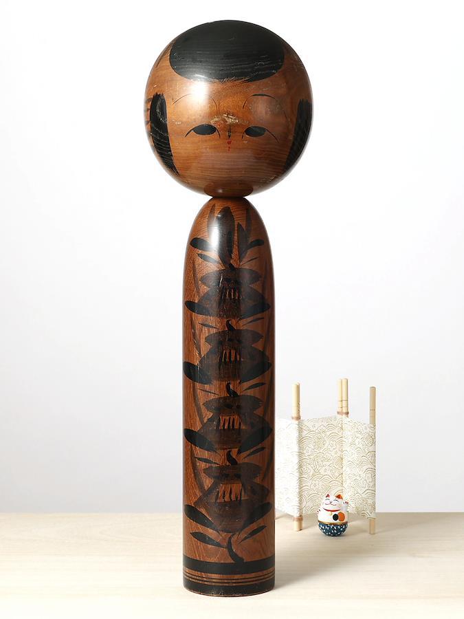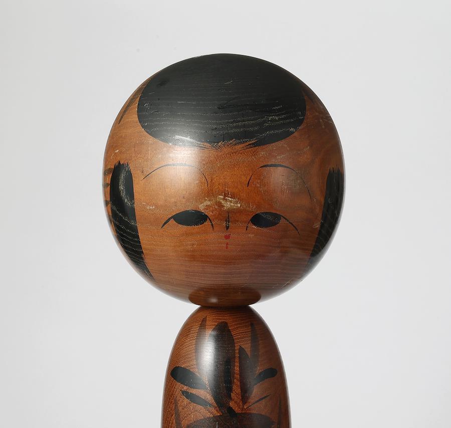 ★こけしカテゴリー:新型(しんがた)こけし(Shingata kokeshi doll)★作者:二代目 武周★デザイン:武周(二代目)作の新型こけし。濃い木地に描かれたモノトーンの花模様が静かな神秘性を感じさせます。経年によるへこみや退色はありますが、その穏やかなまなざしが心に残ります。日本では、表情は口よりも「目」で表すとされ、こけしの口が小さく描かれるのもそのためです。やさしい瞳にそっと目を向けると、語りかけるような温もりが伝わってきます。