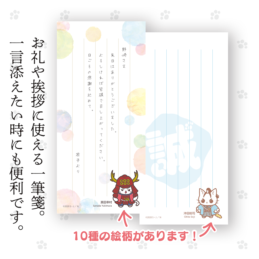 一筆箋用紙のデザインは、表紙のキャラクターが右下でポージングしています。背景2種類・10柄の20綴で内容はすべて異なります。