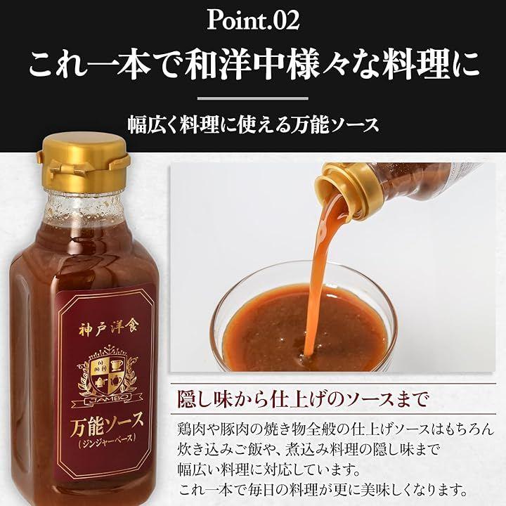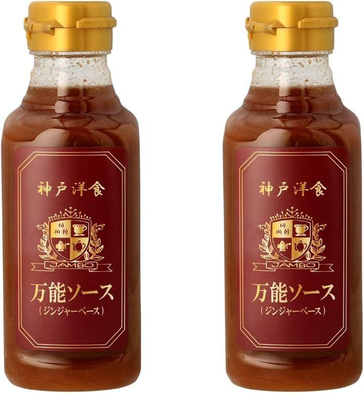 「商品名」万能ソース(ジンジャーベース)「内容量」300mlx2本「原材料」発酵調味料(国内製造)、たまねぎ、りんご、醤油、糖類(水飴、果糖ぶどう糖液糖)、しょうが、はちみつ、香辛料、食塩、豆板醤「添加物」酒精、調味料(アミノ酸など)、V.B1「ブランド」洋食ジャンボ「賞味期限」製造より24ヵ月