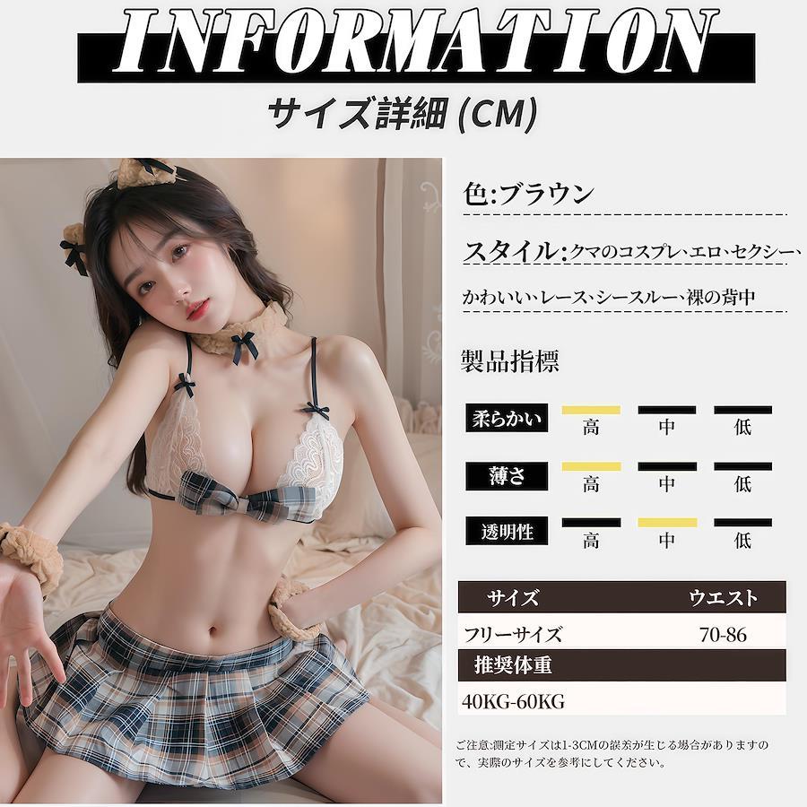 原産国 中国【製品の特徴】:①豪華な7点セット内容:ヘアバンド、ネックリング、ブラジャー、ミニスカート、手リング*2、Tバック、網タイツ。クマのコスプレ、超可愛い。②ブラジャーはレースのシースルーデザインを採用しており、胸全体が露出しており、とてもエロティックです。ブラジャーのフロントには大きな蝶結びが付いており、よりキュートに見えます。③ミニスカートにはクマの尻尾が飾られており、クマ耳のヘアバンドと組み合わせており、とても魅力的です。④背中が露出しており、女性の色気がはっきりと出ています。誘惑に満ちていて、知らず知らずのうちにパートナーの性◯欲をすぐに刺激します。⑤スカート部分はミニスカートスタイルを採用して、お尻を露出させ、エロです。【セット内容】:ヘアバンド、ネックリング、ブラジャー、ミニスカート、手リング*2、Tバック、網タイツ【サイズ】:フリーサイズ。ウエスト:70cm-86cm。推奨体重:40KG-60KG。【素材】:ポリエステル。薄くて柔らかく着心地が良いです。【おすすめの対象】:バレンタインデー、恋愛記念日、結婚旅行、結婚記念日、恋愛の倦怠期、クリスマスなど、欠かせないプレゼントです。セクシーランジェリーは、心の中に埋もれていた欲望を目覚めさせ、パートナー間の情熱に火をつけ、毎日を新婚初夜と同じくらい情熱的なものにすることができます。(#lf)(#lf)(#lf)商品購入前に、ストア紹介ページをご確認ください。