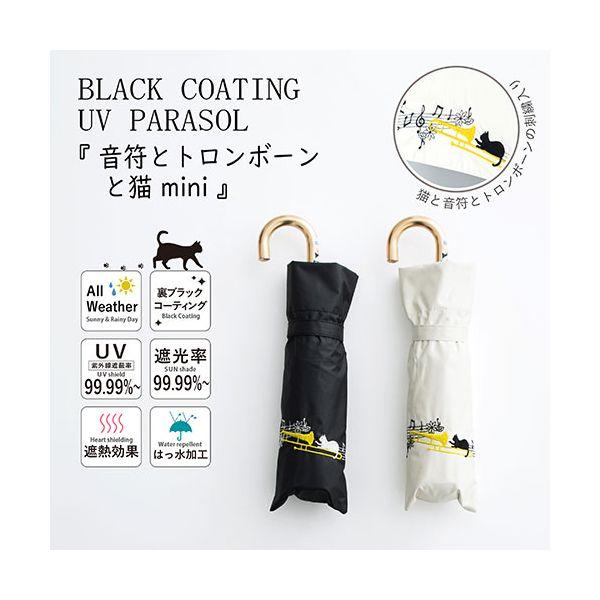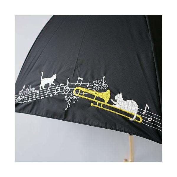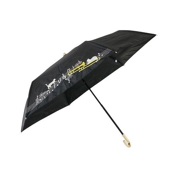 猫と音符モチーフの組み合わせってなんでこんなにかわいいんでしょう・・・正面1駒に、五線譜&音符に黄色がアクセントのトロンボーンモチーフを刺繍しました。そこに猫ちゃんが2匹くつろいでいる、猫好きさんだけでなく音楽好きさんにもおすすめの黒コーティング晴雨兼用折りたたみ傘です。