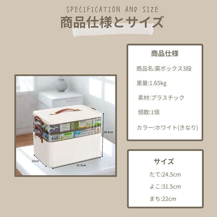 「商品仕様」商品名:薬ボックス3段 重量:1.65kg 素材:プラスチック サイズ 縦24.5cm 横31.5cm 奥行き22cm 個数:1個 カラー:ホワイト(きなり)