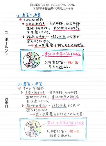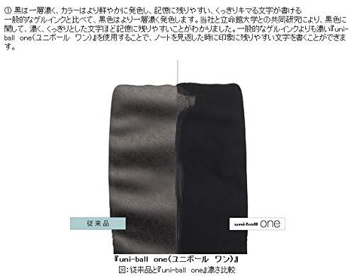 【新開発の「ユニボール ワンインク」の3つの特長】(1)黒は一層濃く、カラーはより鮮やかに発色し、記憶に残りやすい、くっきりキマる文字が書ける。一般的なゲルインクと比べて、黒色はより一層濃く発色します。当社と立命館大学との共同研究により、黒色に関して、濃く、くっきりとした文字ほど記憶に残りやすいことがわかりました。一般的なゲルインクよりも濃い『uni-ball one(ユニボールワン)』を使用することで、ノートを見返した時に印象に残りやすい文字を書くことができます。