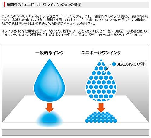 (2)にじまず、速乾性の高いインク一般的な速乾性インクは、紙面へのインクの浸透を速くすることで速乾を実現しています。そのため、インクのにじみや裏抜けが起こることがありました。新開発の「ユニボール ワンインク」は、インク内の固形と液体の成分比を変えることで、液体成分を素早く紙面へ浸透させながらも、固形分である色材を紙面に残すことを可能にしています。紙面への浸透が速い速乾性インクでありながら、色材が紙面に吸収されるのを抑えるため、にじまず、裏抜けしません。