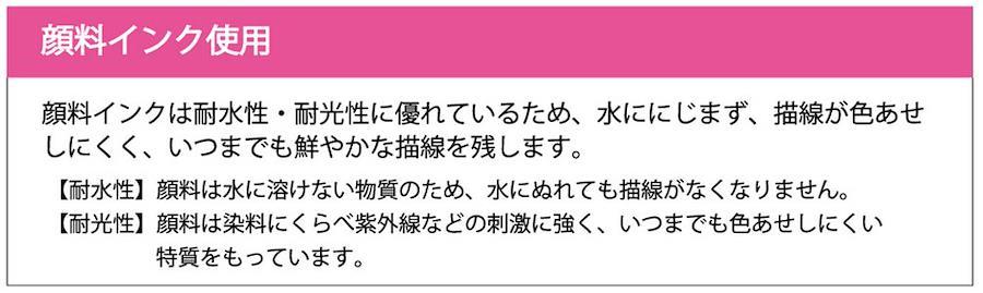 顔料インクのため、水ににじまず、描色あせにくく、いつまでも鮮やかな描線が残ります。