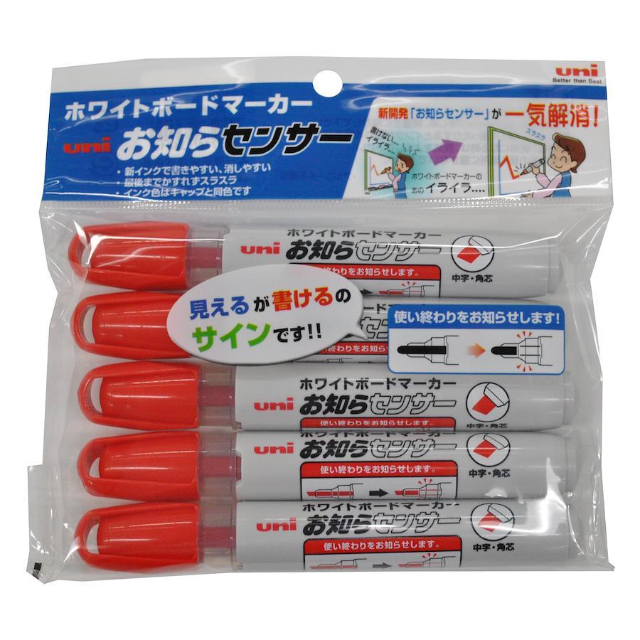 【ホワイトボードマーカーの不満点をお知らせセンサーが一気に解消! 】書ける?書けない?がひと目でわかるホワイトボードマーカーお知らセンサーの中字角芯の赤5本パックです。最後までかすれずに、書きやすく、消しやすい新開発インク採用しました。簡単に詰替え可能なカートリッジ式で節約にも最適です。