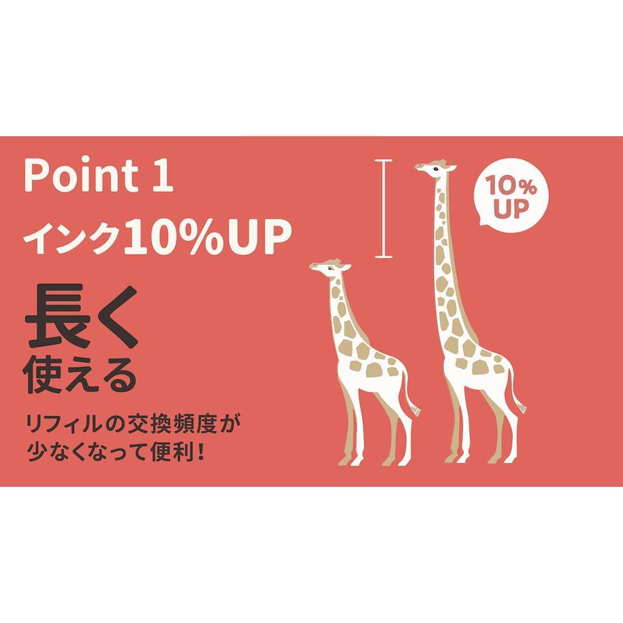 ■内容量10%増量し、1本のリフィルをより長く使用できる従来リフィルと比較しインク量を10%増量しており、1本のリフィルをより長くお使いいただけます。