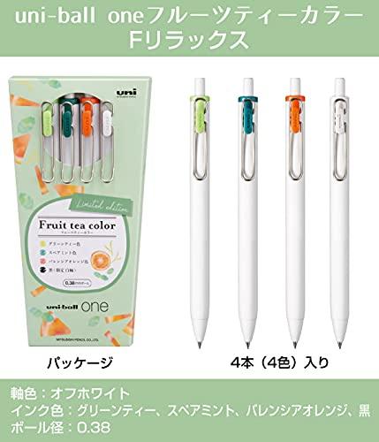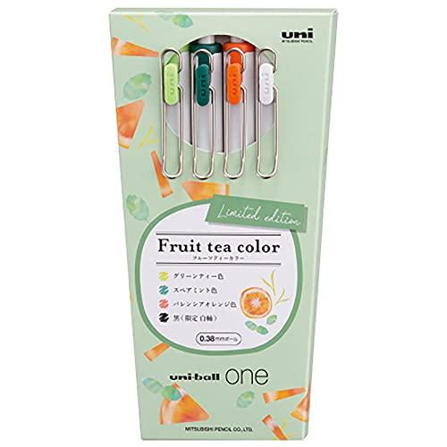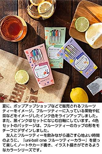 ■uni-ball oneフルーツティーカラーの商品特長夏に、ポップアップショップなどで販売されるフルーツティーをイメージ。フルーツティーに入っている果物や紅茶などをイメージしたインク色をラインアップしました。また、黒インクはセットになじむ白軸にしています。4色セットのパッケージは、フルーツティーのカップの形をモチーフにデザインしました。友人とフルーツティーを飲みながら過ごす心地よい時間のように、『uni-ball one フルーツティーカラー』を使って楽しくノートやカード書き、イラスト描きができるようなカラーシリーズです。