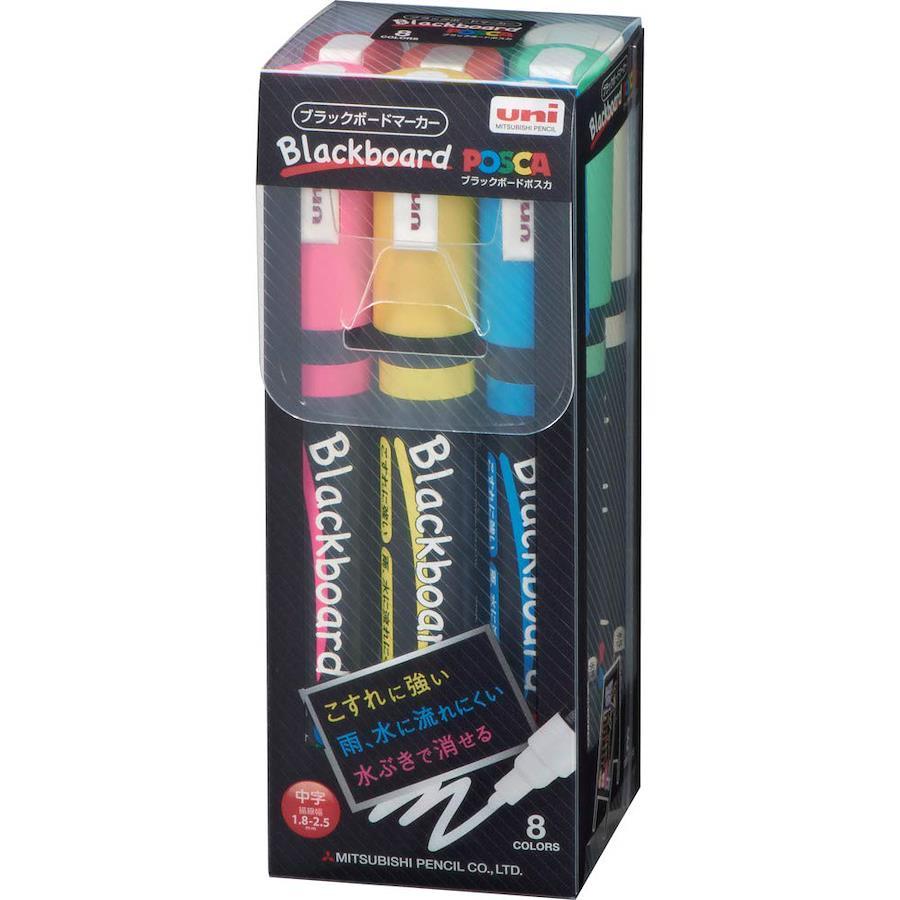 「ブラックボードポスカ」は従来より発売しております『ポスカ』のインク改良を行い、水ぶきで消せる性能を持たせました。