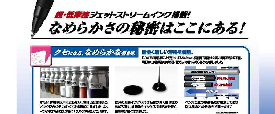 【超・低摩擦ジェットストリームインク搭載! 】世界初の画期的なインクで、低い筆記抵抗でクセになるなめらかな書き味を実現しました。またインクの乾きがスピーディーなので、手が汚れるストレスも軽減します。ツインボール機構によりインクの逆流も防ぎ、ペン先からのインク漏れを防ぐためのスプリングチップを内蔵しています。
